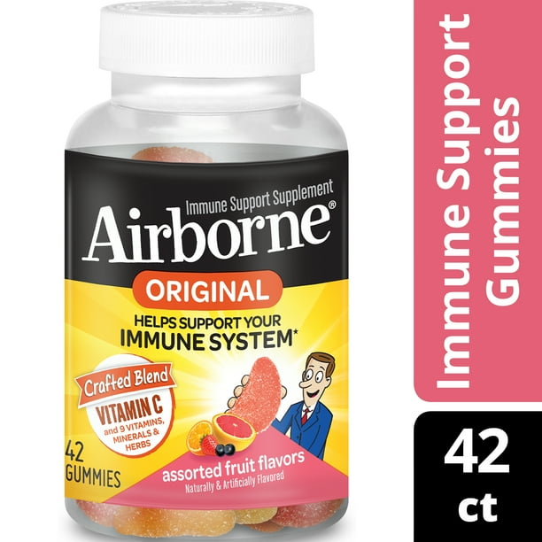 Airborne offers a blast of immune support with its crafted blend of vitamins minerals and our proprietary herbal blend which includes echinacea and ginger.